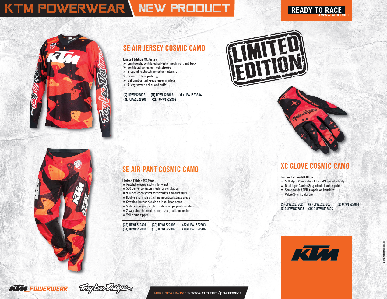 Za nami już prawie połowa sierpnia 2015, więc na dniach do sieci dealerskiej powinny trafić katalogi z kolekcją KTM PowerWear 2016, a także sama kolekcja! Kilka dni temu Pomarańczowi zaprezentowali już jednak opracowany z Troy Lee Designs komplet z asortymentu off-road, mianowicie kozackie moro Cosmic Camo, w którym będziesz mógł ruszyć na kolejną, motocrossową bitwę!